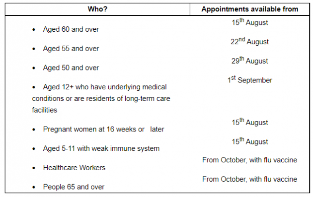 Further cohorts are set to be invited to book a second booster over the coming weeks, with appointments to be available for those aged 55 and over from 22 August, and 29 August for those aged 50 and over.